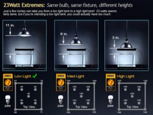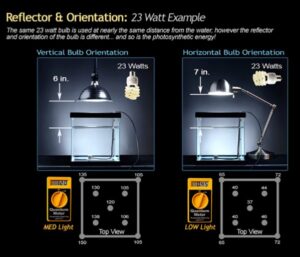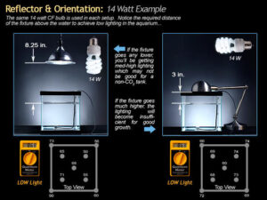 Tidak semua jenis lampu dengan watt yang sama memancarkan cahaya yang sama, sebagai contoh 24 watt lampu pc/ulir intensitasnya tidak sekuat 25 watt lampu T5HO. Demikian juga dengan lampu LED, kualitas reflectornya juga berpengaruh terhadap intensitas cahaya, dan posisi lampu di atas aquarium juga berpengaruh terhadap intensitas cahaya di dasar aquarium.
