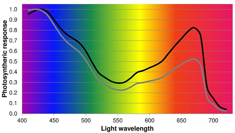 Ternyata tanaman lebih banyak menyerap sinar berwarna biru dengan panjang gelombang antara 440-470 nm dan sinar berwarna merah antara 640-660 nm. Spektrum warna inilah yang paling efektif bagi klorofil untuk melakukan fotosintesis.